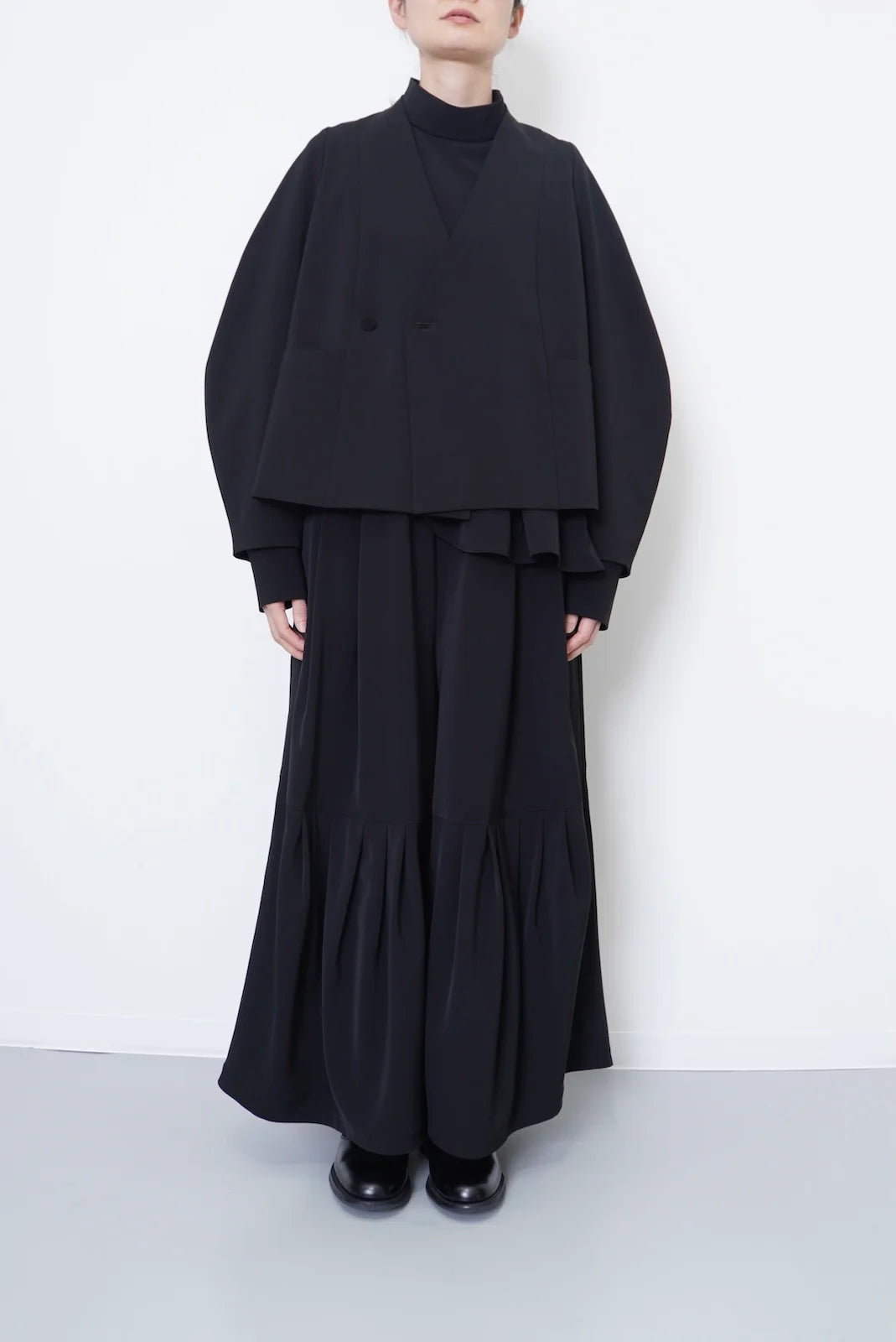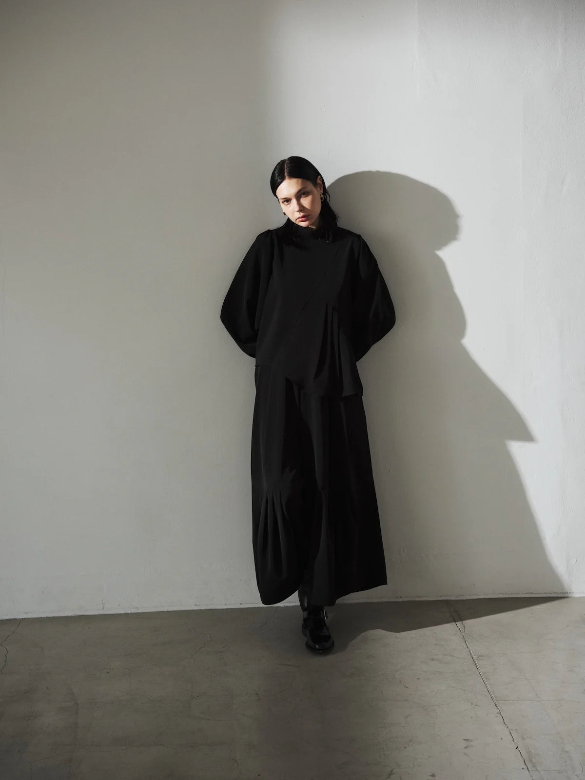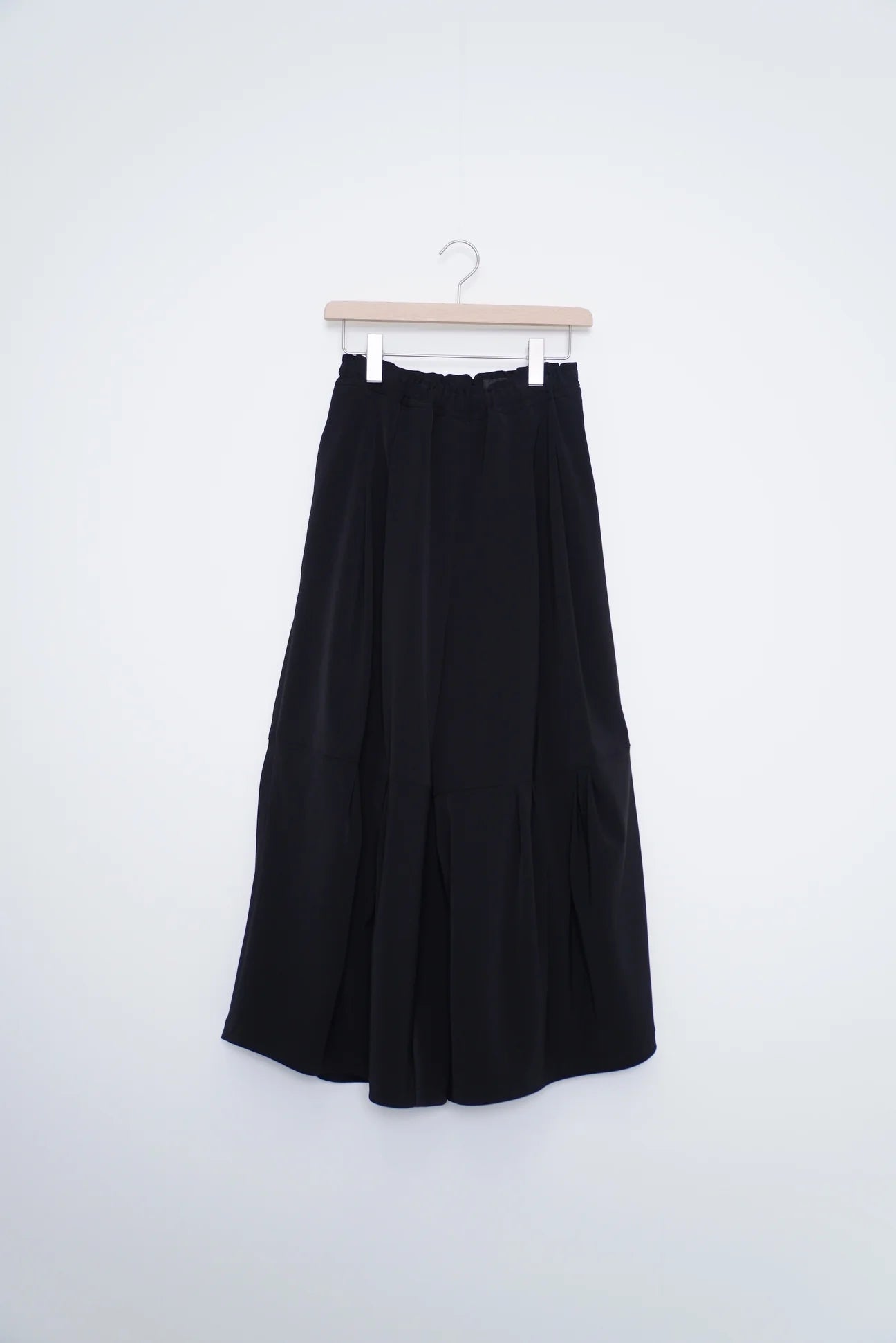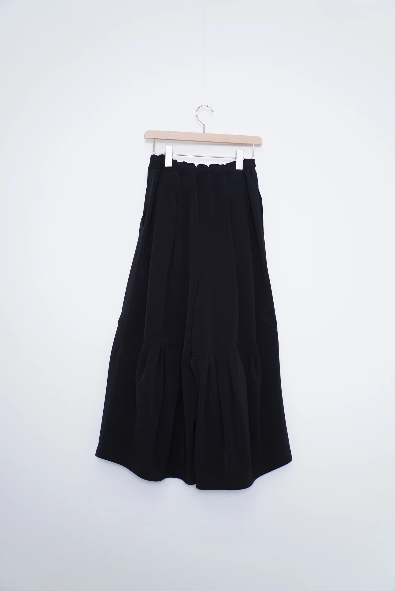 The dress pants skirt features tucks at the seams that add volume and a generous use of fabric, creating a unique silhouette. It also features side pockets for functionality, and the elastic waistband and adjustable drawcord ensure a comfortable fit.