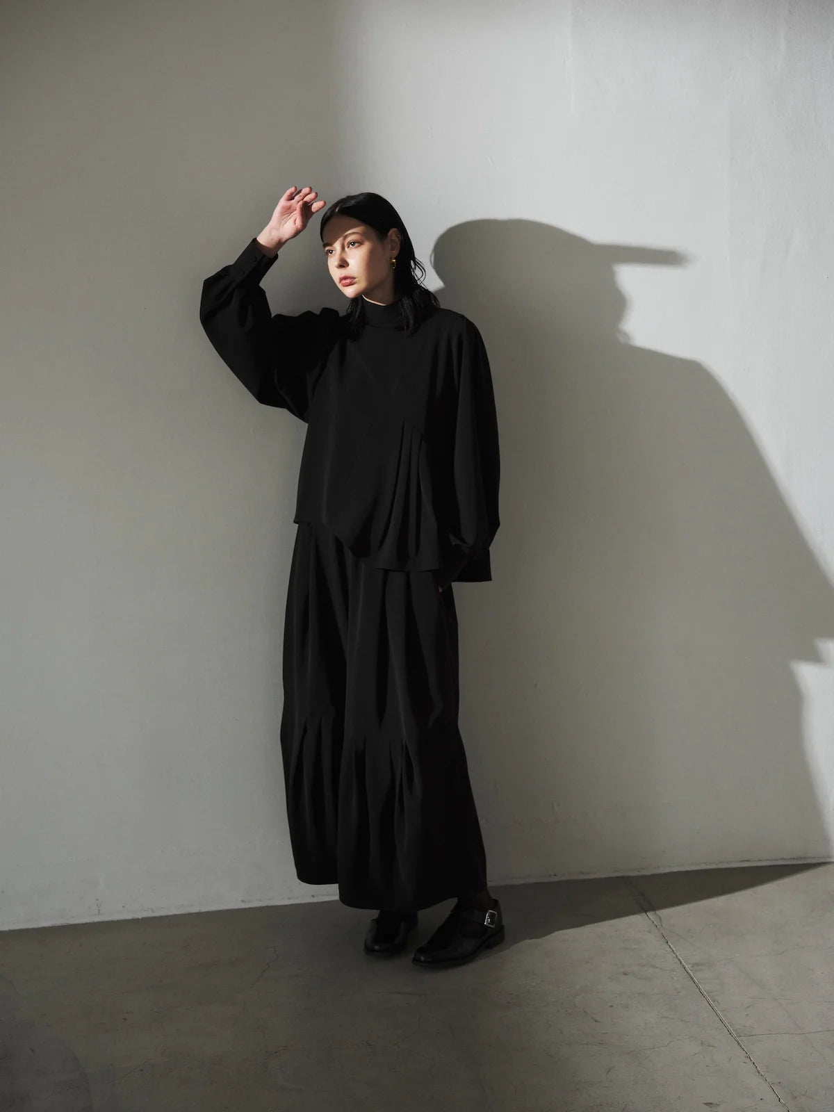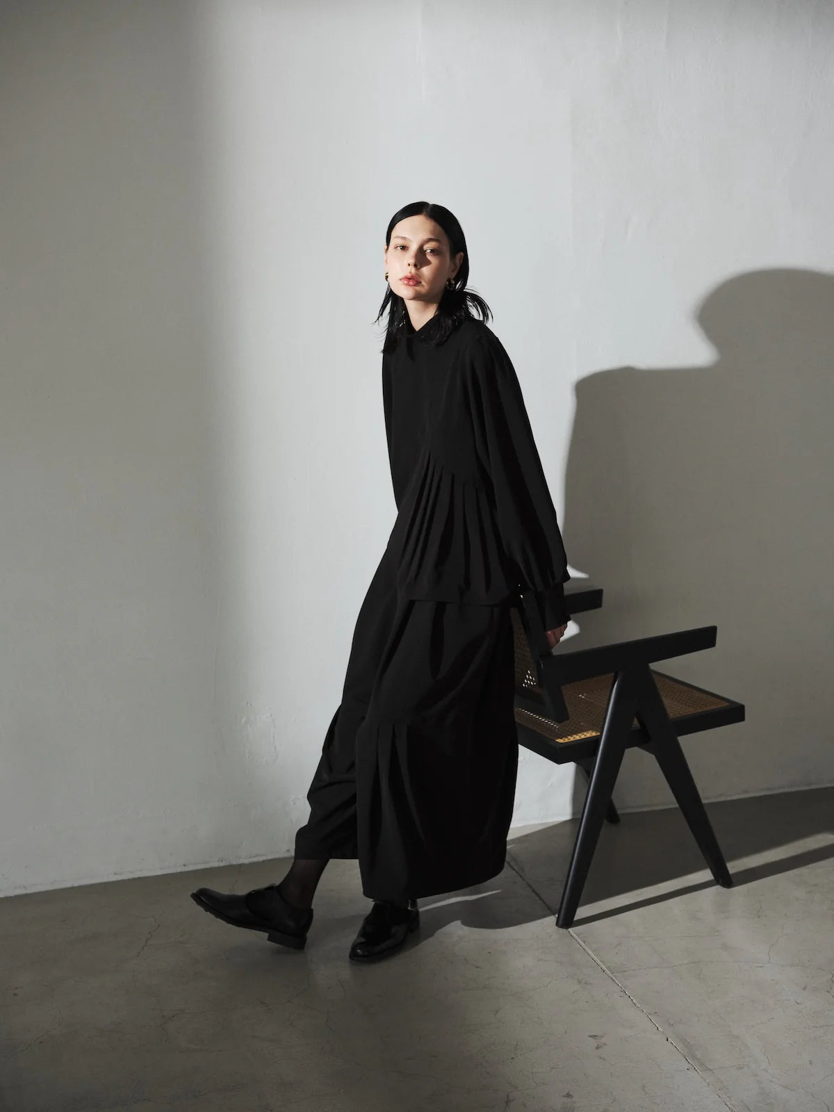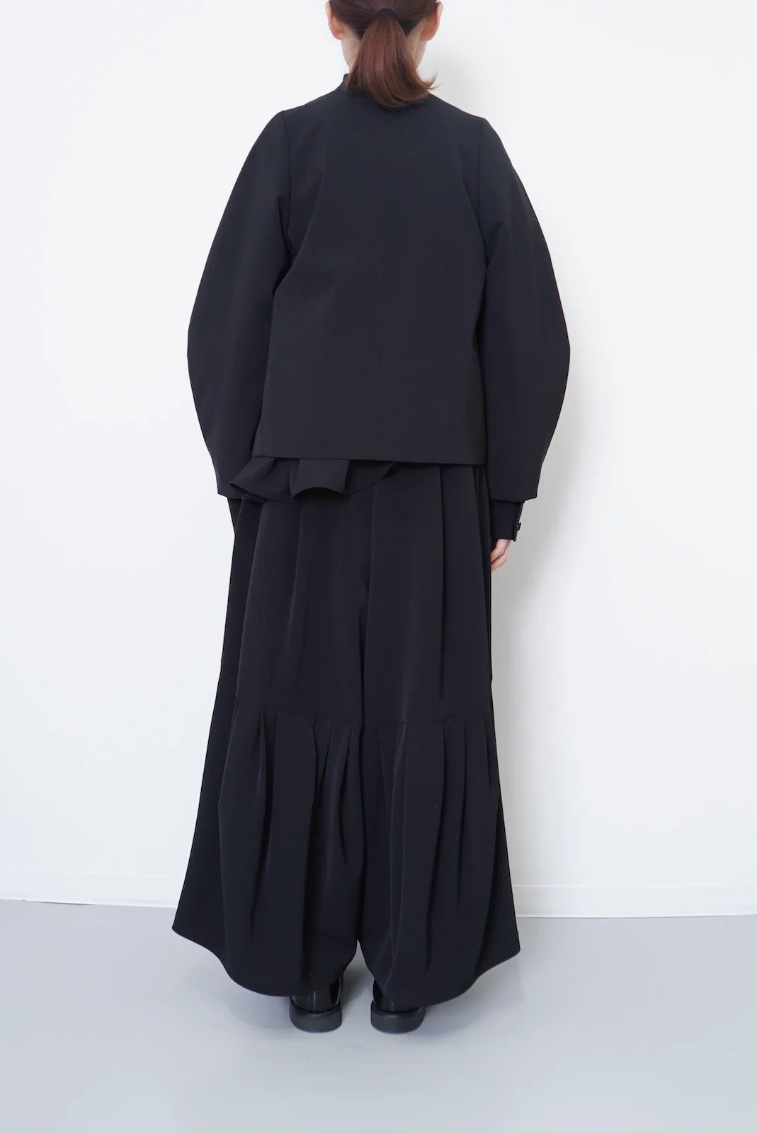 The dress pants skirt features tucks at the seams that add volume and a generous use of fabric, creating a unique silhouette. It also features side pockets for functionality, and the elastic waistband and adjustable drawcord ensure a comfortable fit.