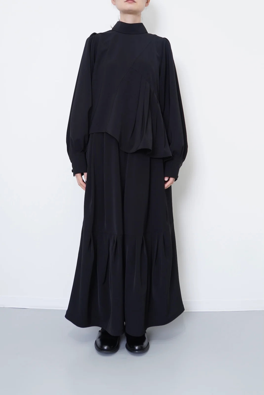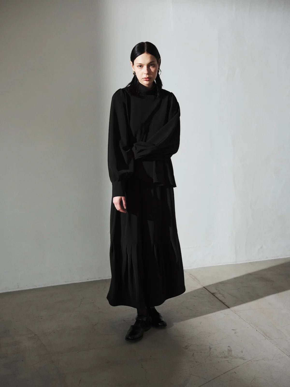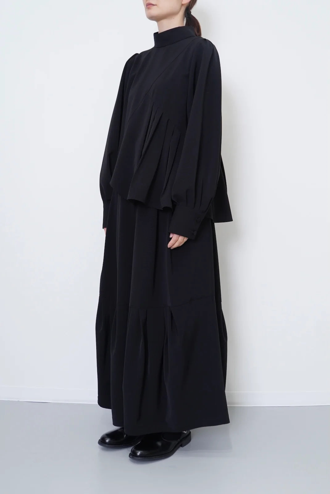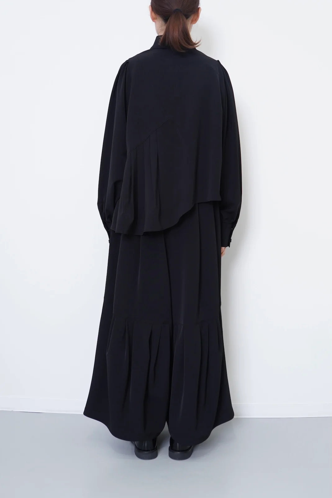 The dress pants skirt features tucks at the seams that add volume and a generous use of fabric, creating a unique silhouette. It also features side pockets for functionality, and the elastic waistband and adjustable drawcord ensure a comfortable fit.