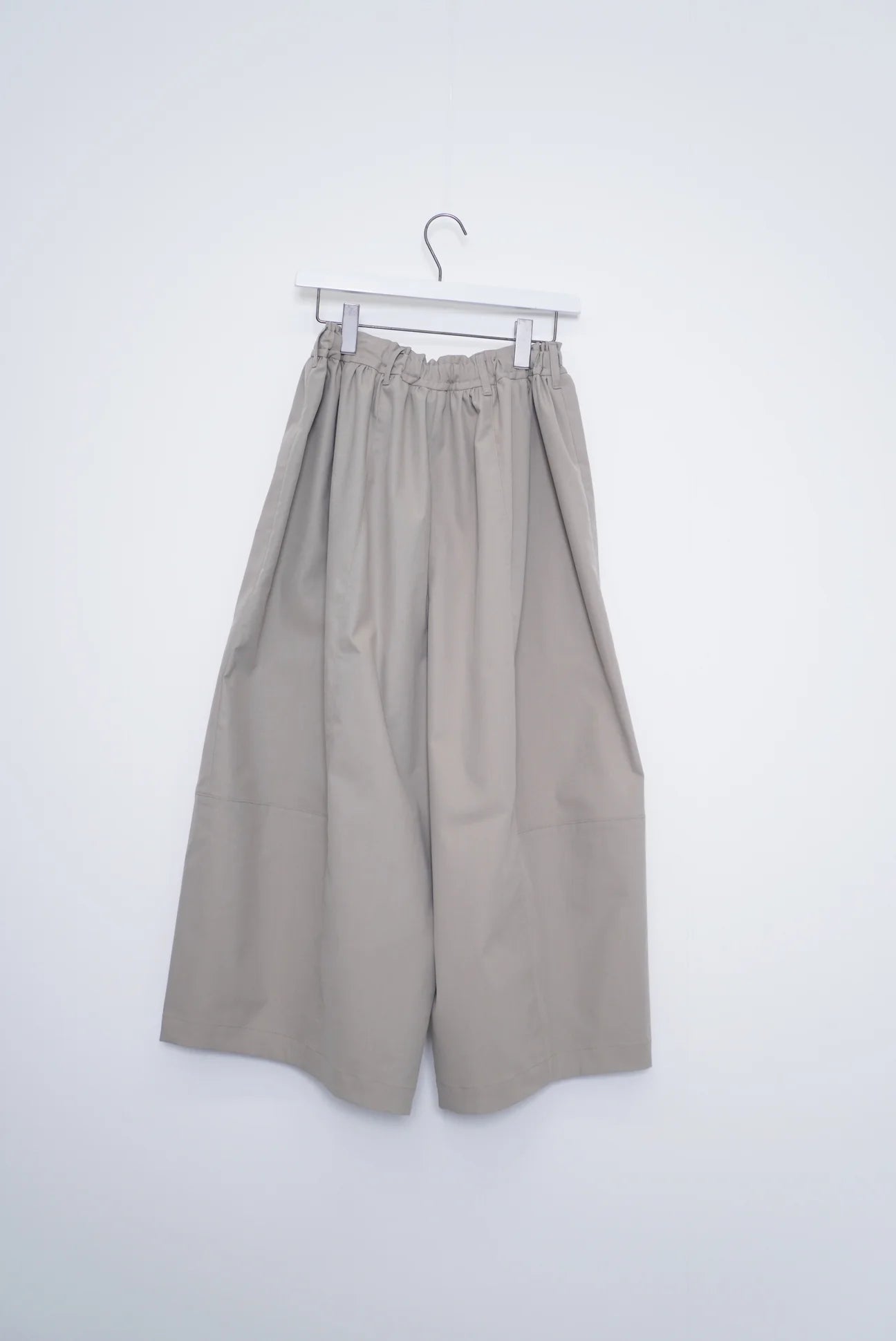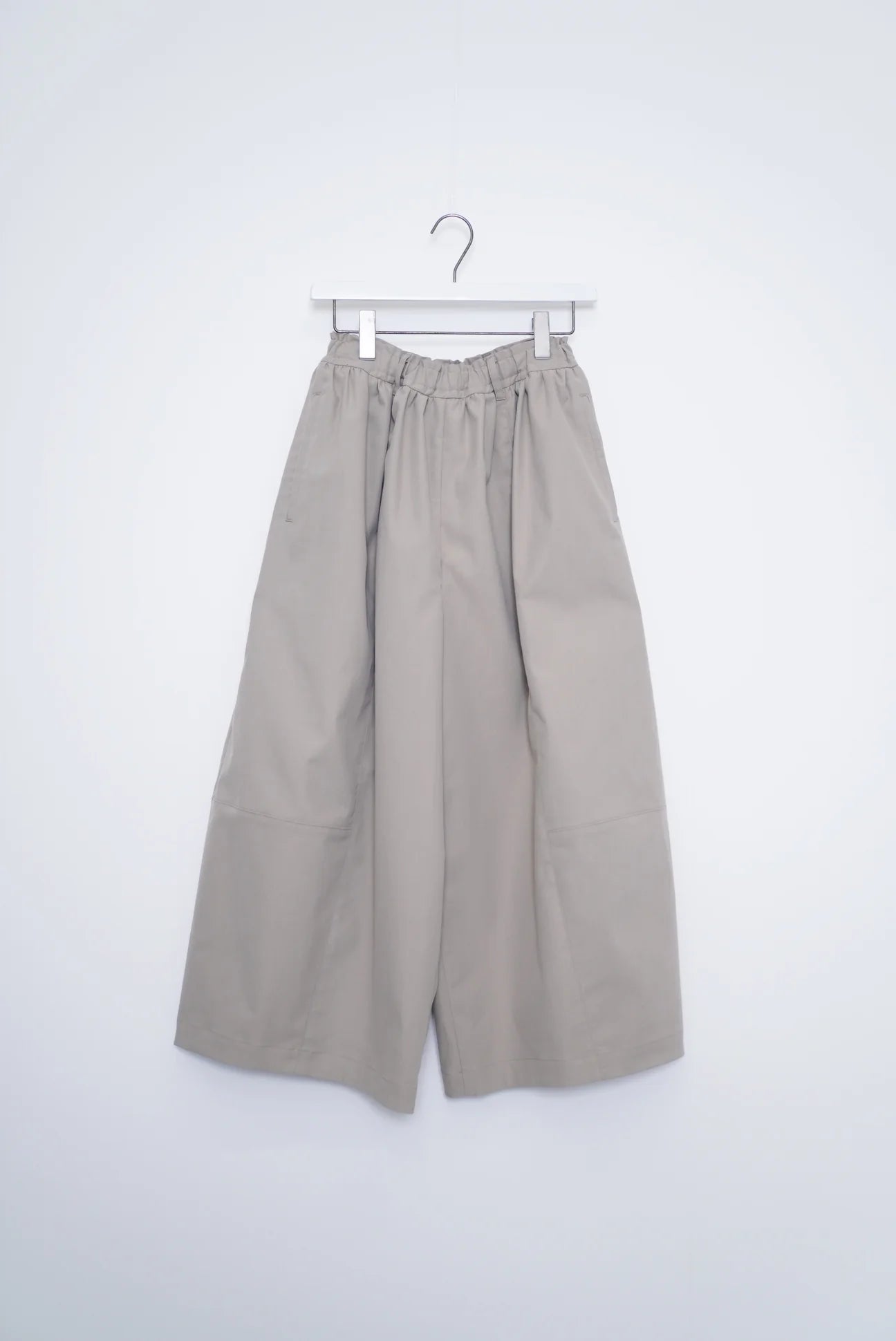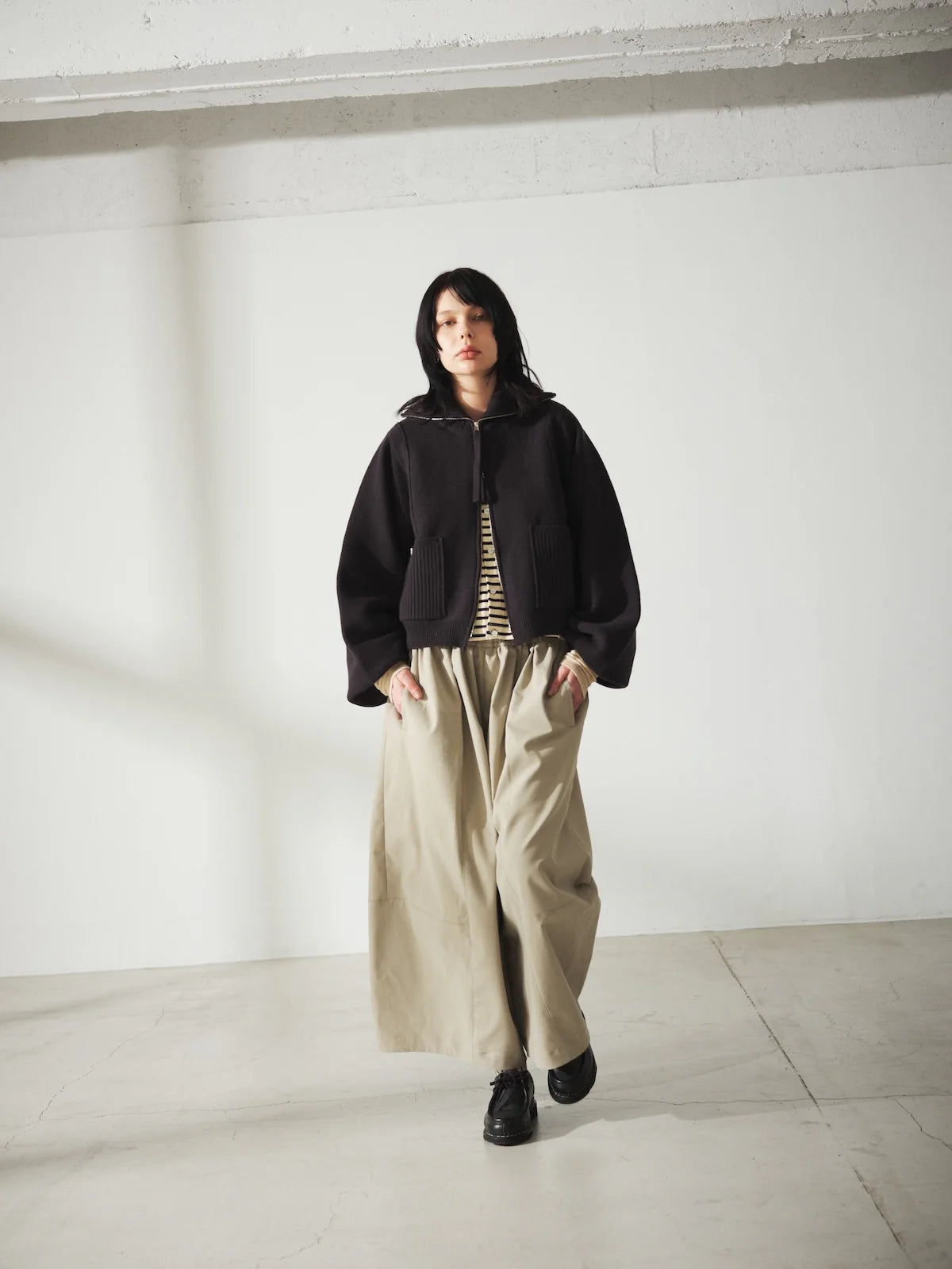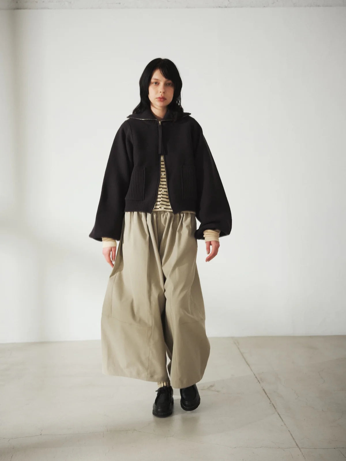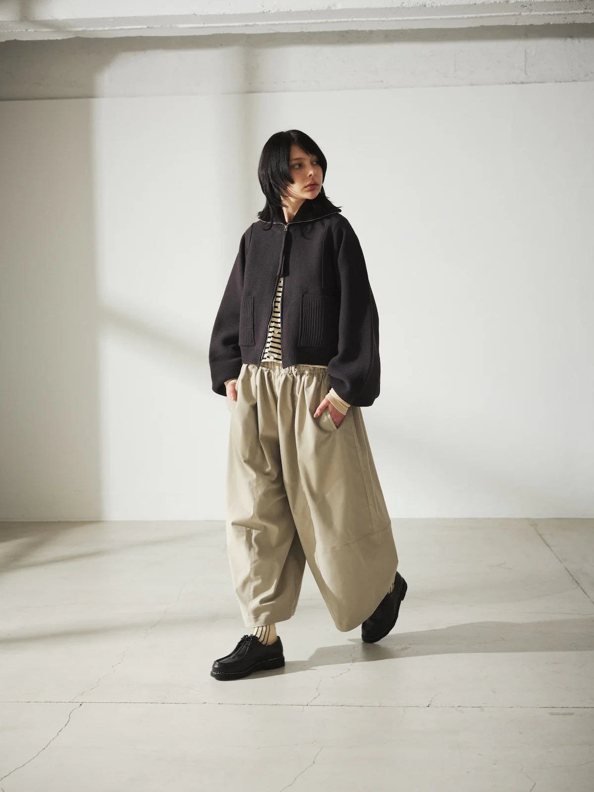 The wide cocoon silhouette is characterized by the amount of gathers at the waist, creating a wide silhouette, while the seam creates a unique, rounded silhouette. Functional pockets on both sides provide functionality, and the elastic waistband and adjustable drawcord ensure a comfortable fit.
