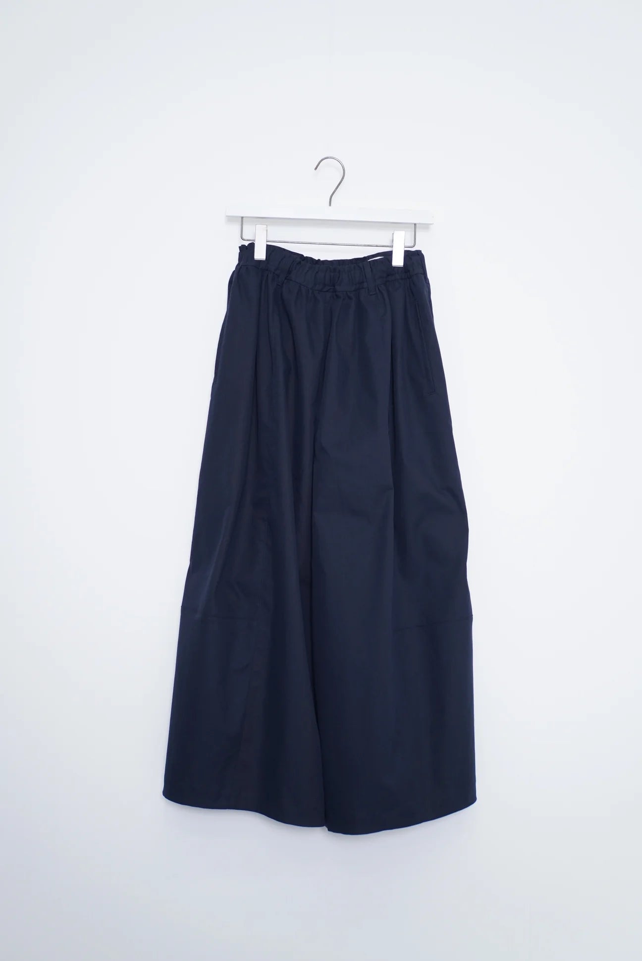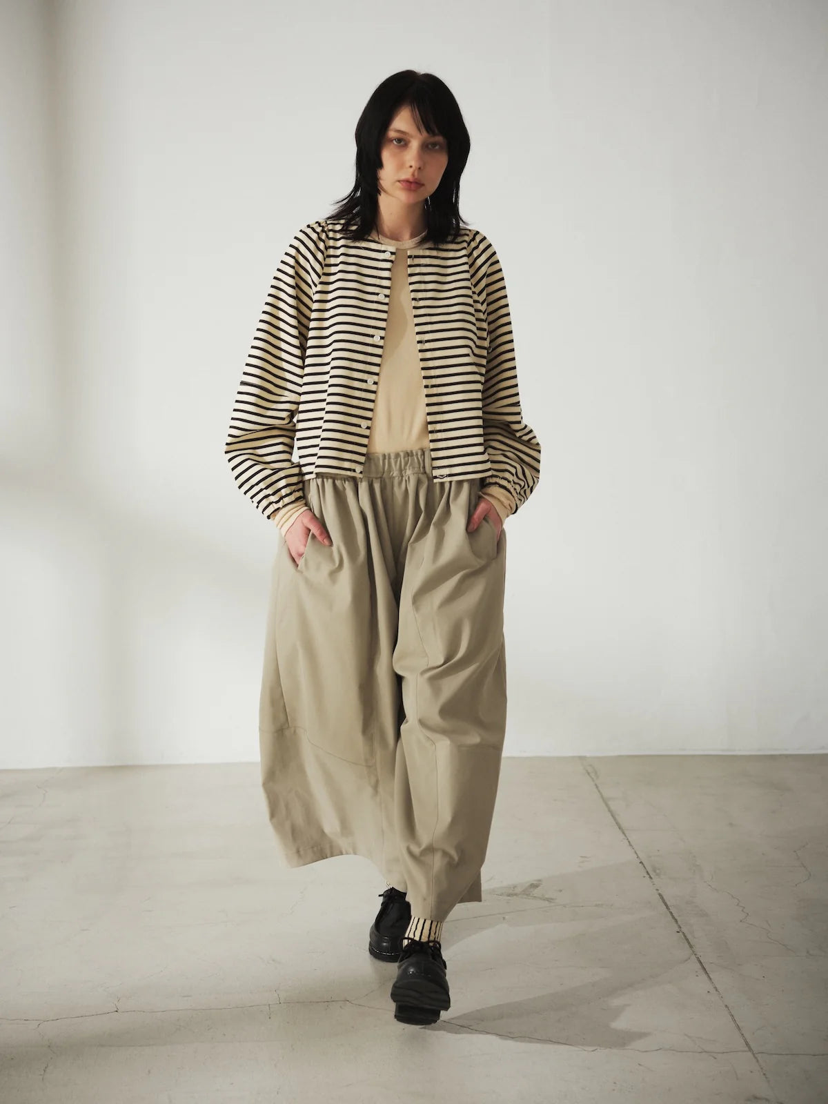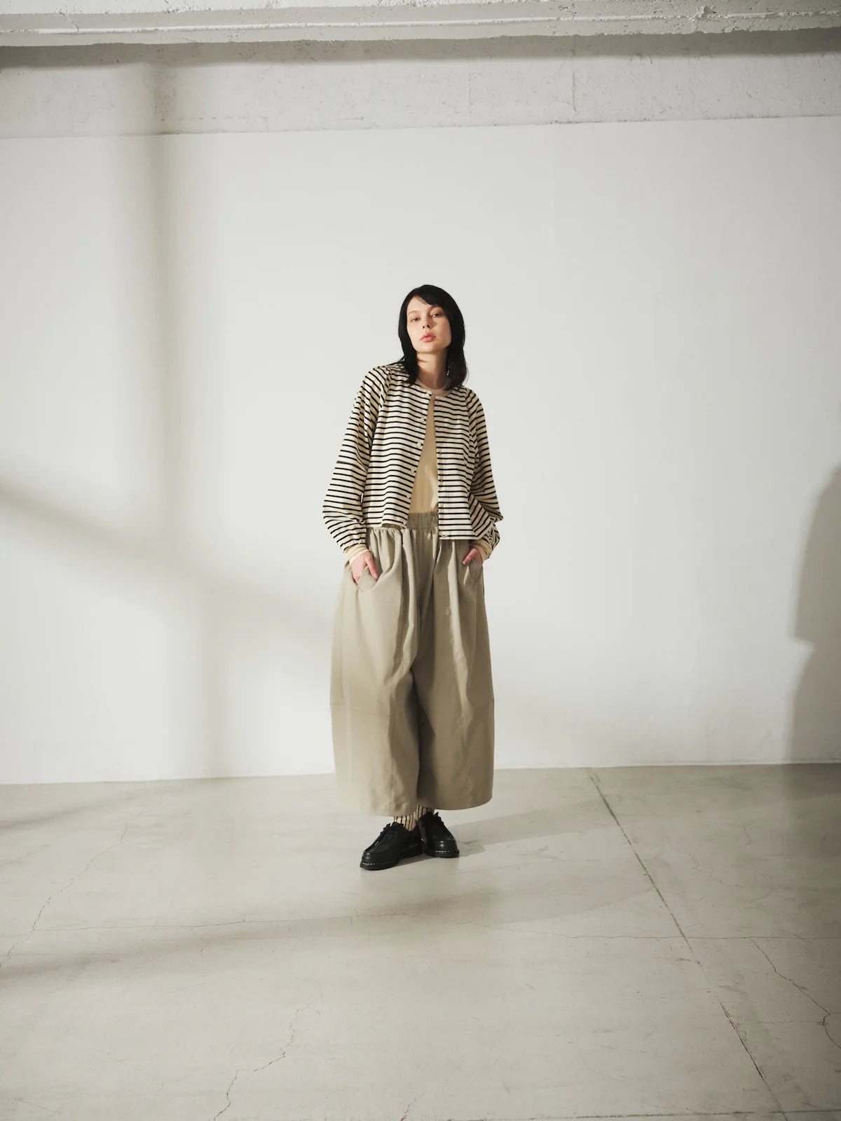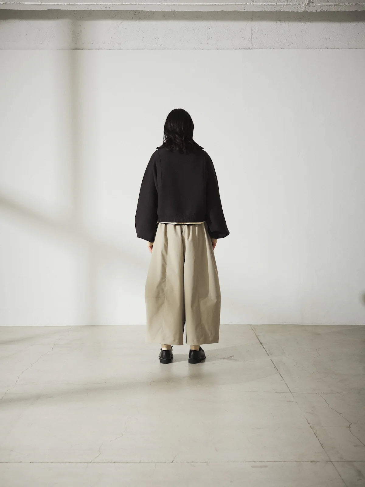 The wide cocoon silhouette is characterized by the amount of gathers at the waist, creating a wide silhouette, while the seam creates a unique, rounded silhouette. Functional pockets on both sides provide functionality, and the elastic waistband and adjustable drawcord ensure a comfortable fit.