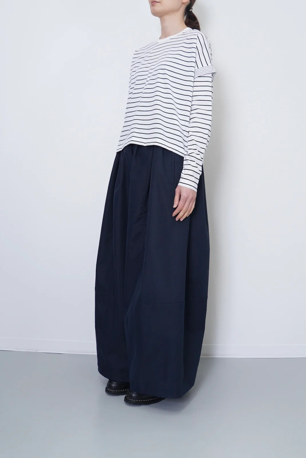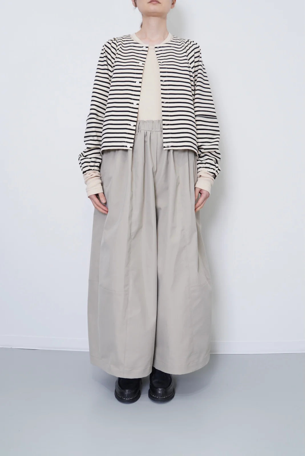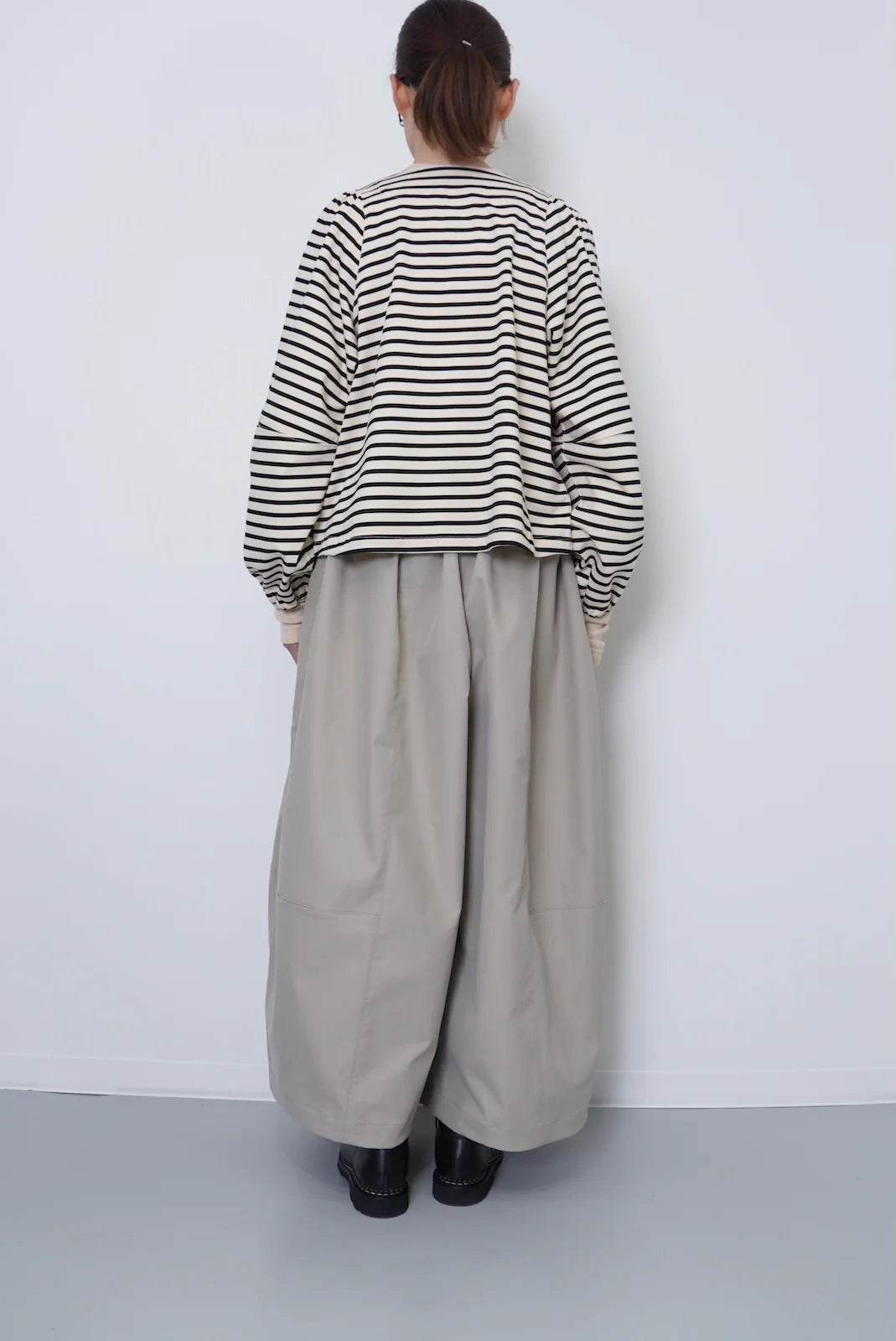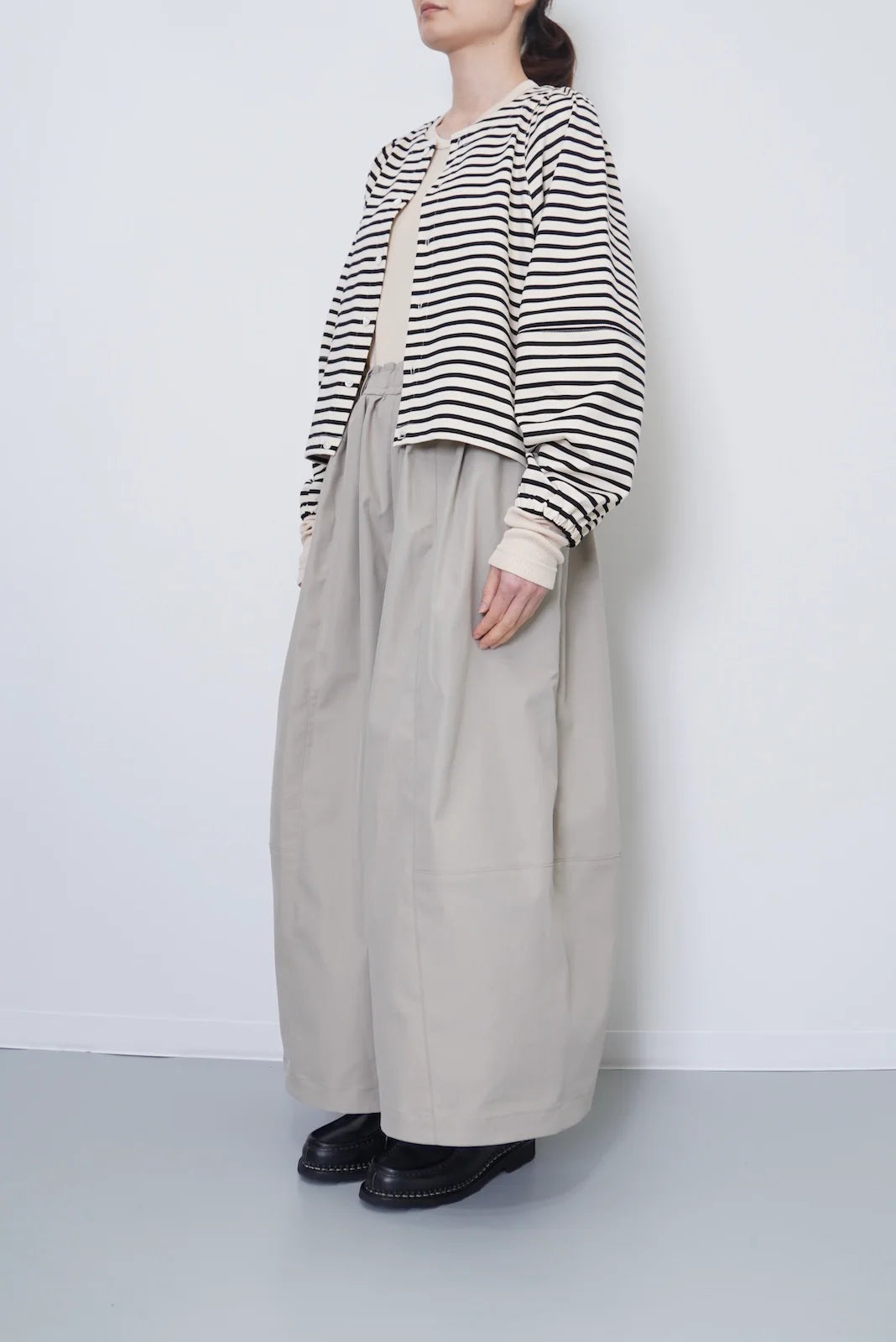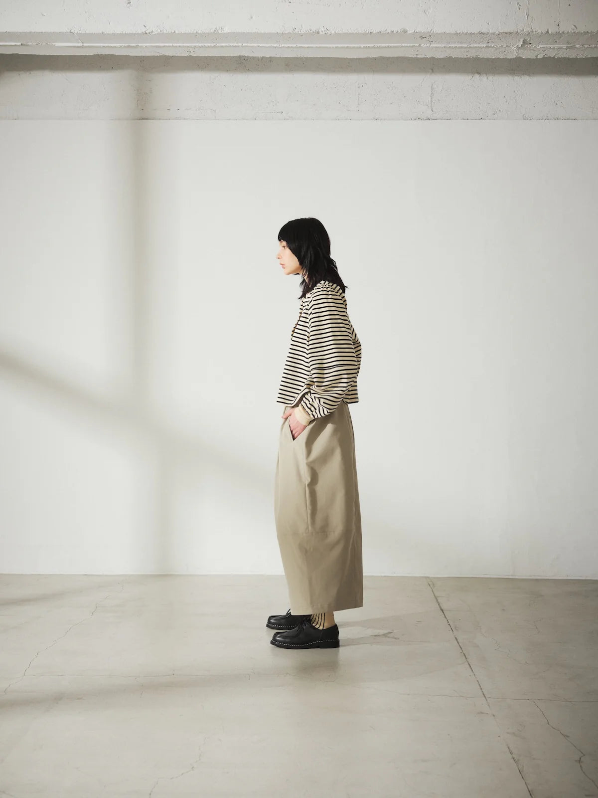 The wide cocoon silhouette is characterized by the amount of gathers at the waist, creating a wide silhouette, while the seam creates a unique, rounded silhouette. Functional pockets on both sides provide functionality, and the elastic waistband and adjustable drawcord ensure a comfortable fit.