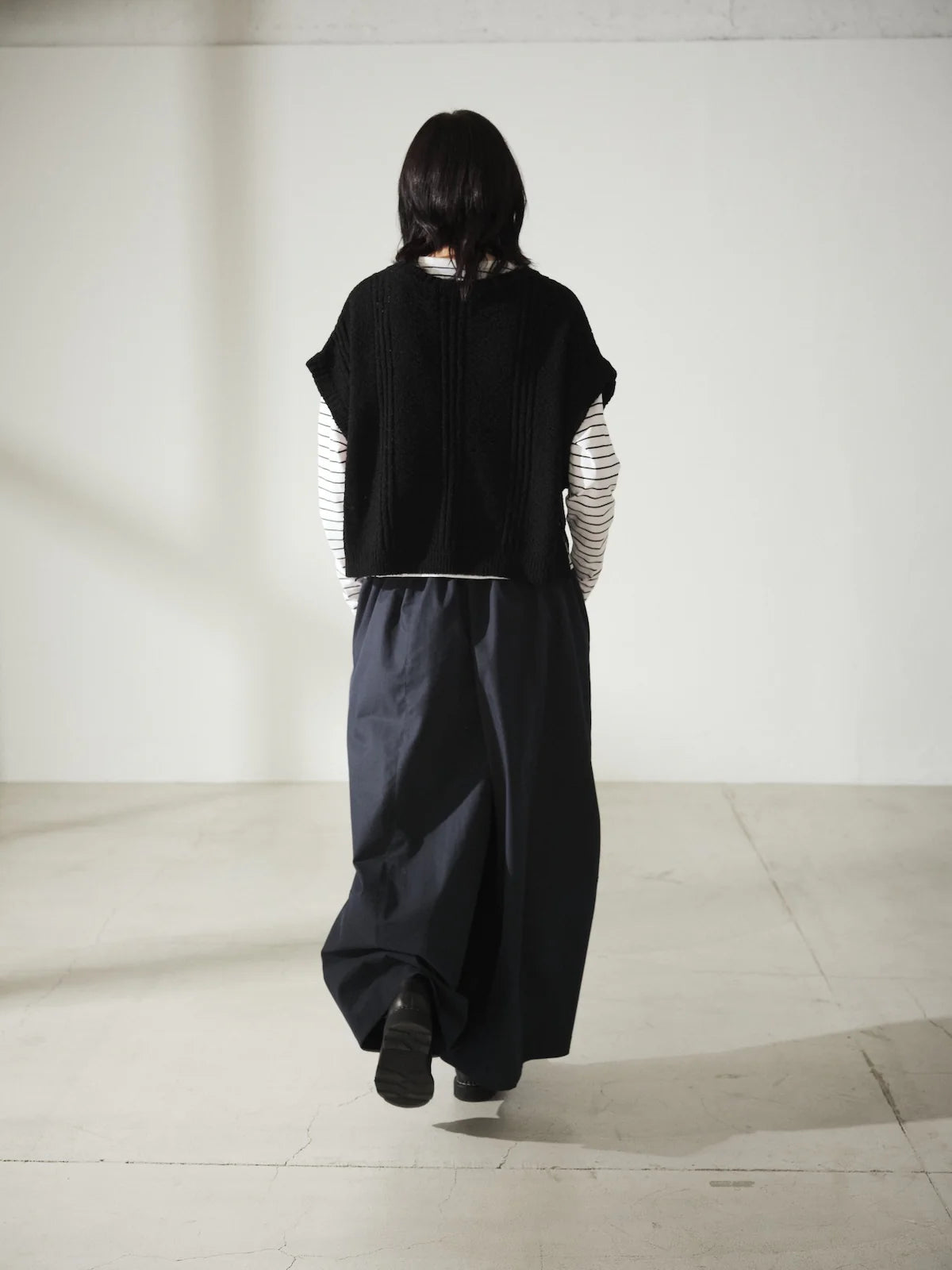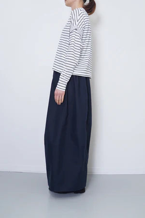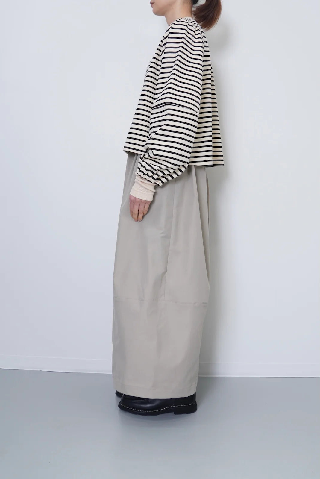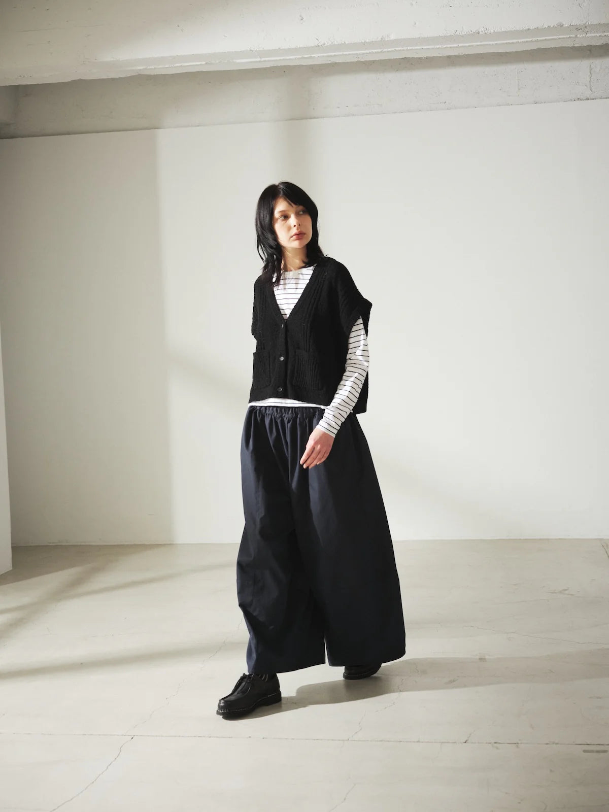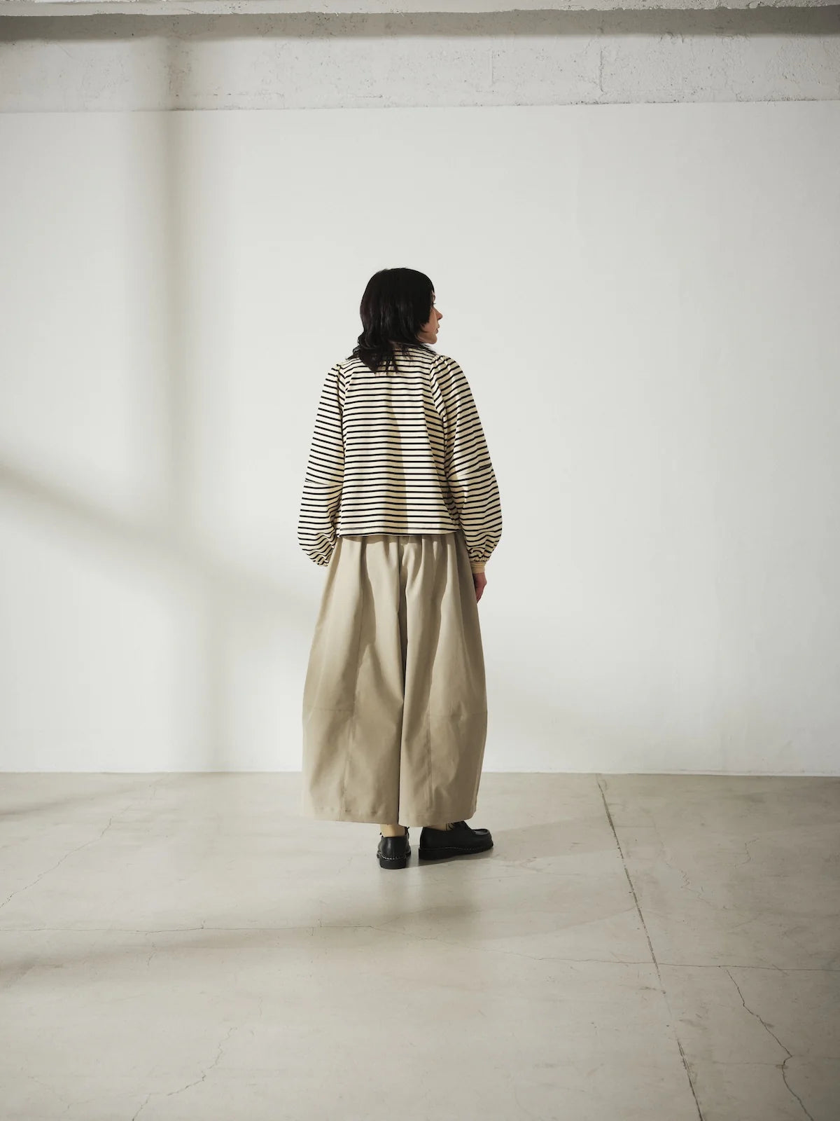 The wide cocoon silhouette is characterized by the amount of gathers at the waist, creating a wide silhouette, while the seam creates a unique, rounded silhouette. Functional pockets on both sides provide functionality, and the elastic waistband and adjustable drawcord ensure a comfortable fit.