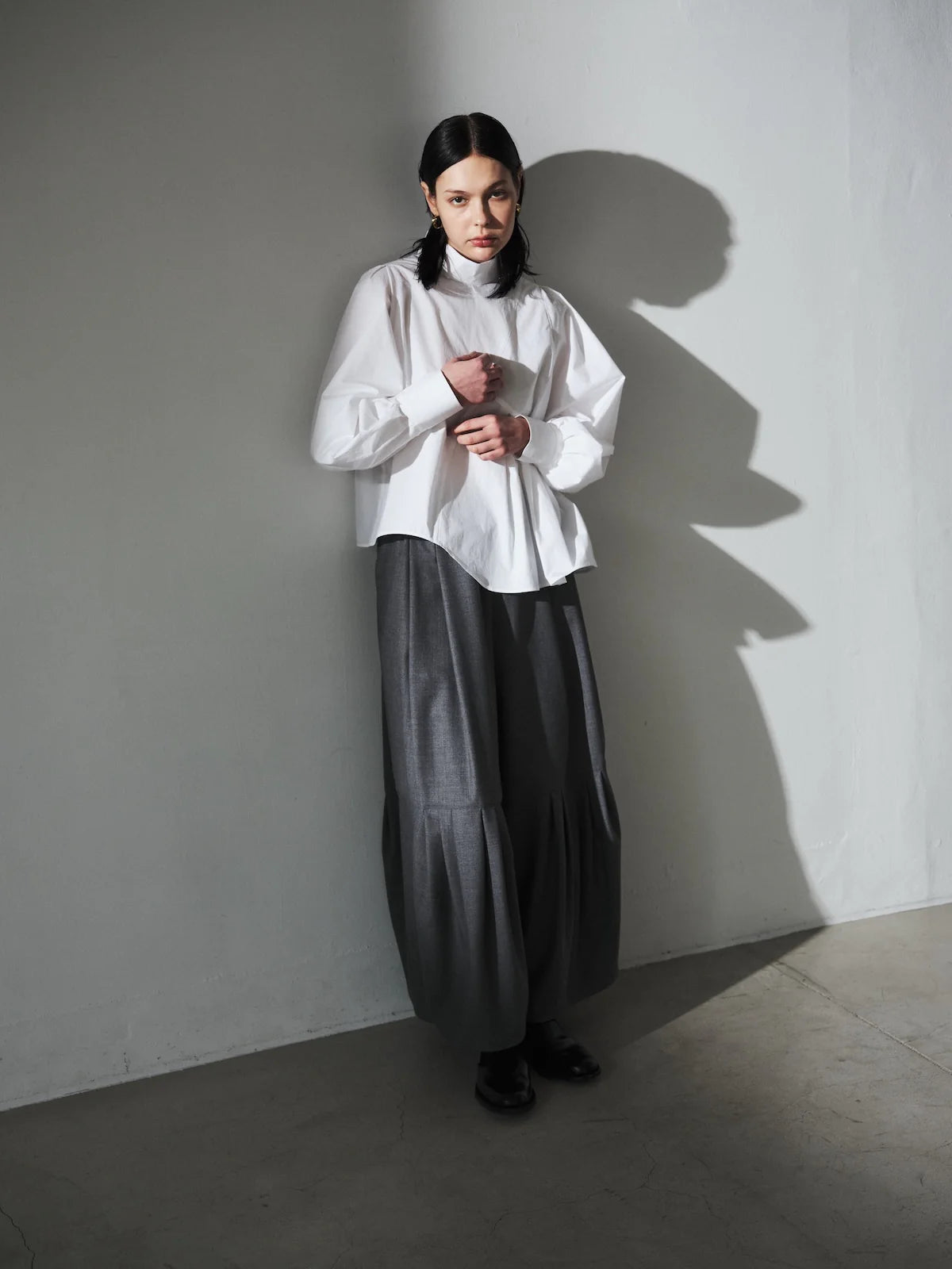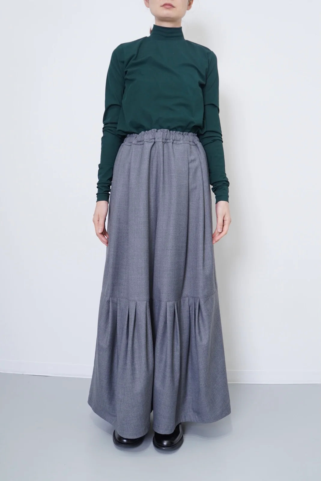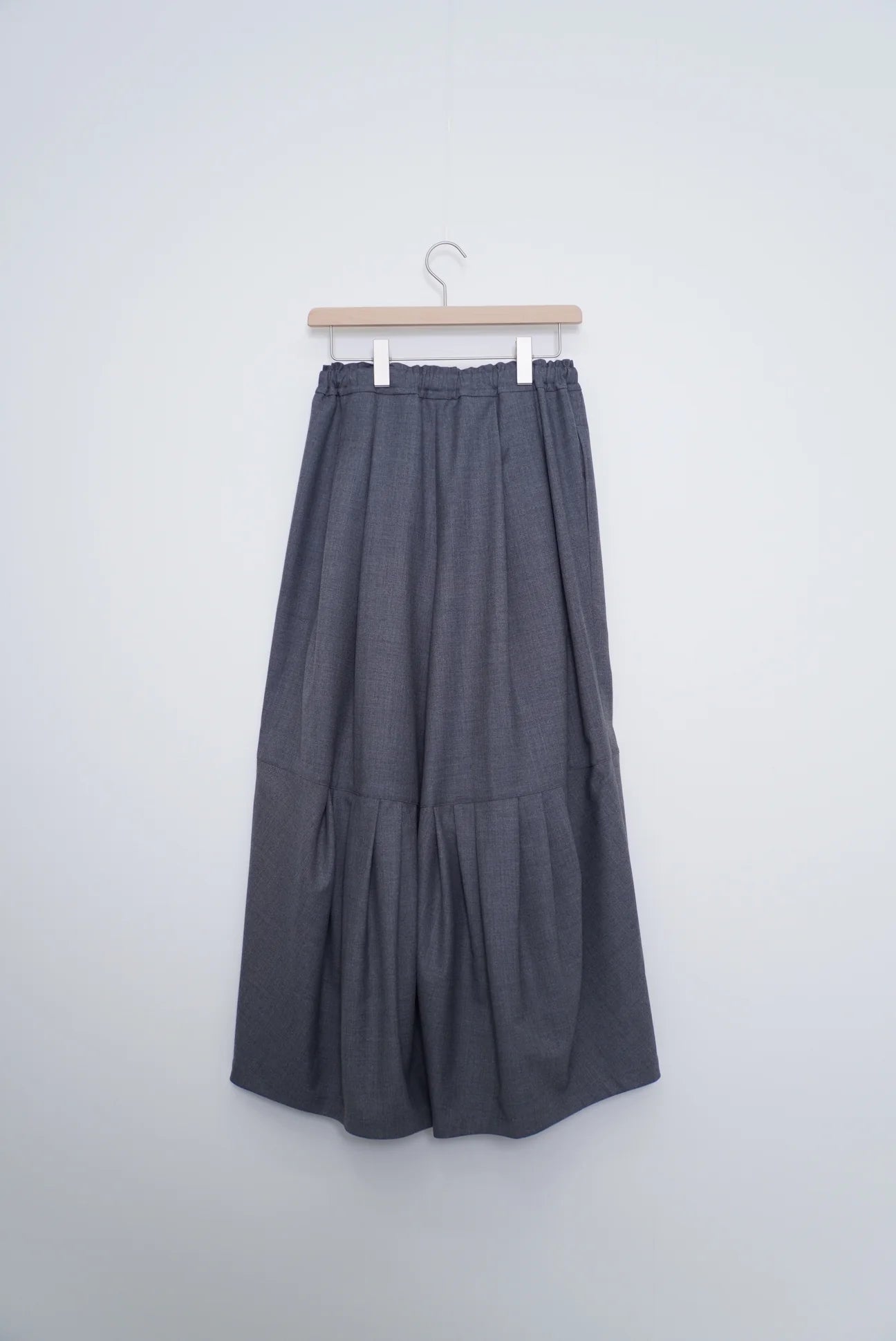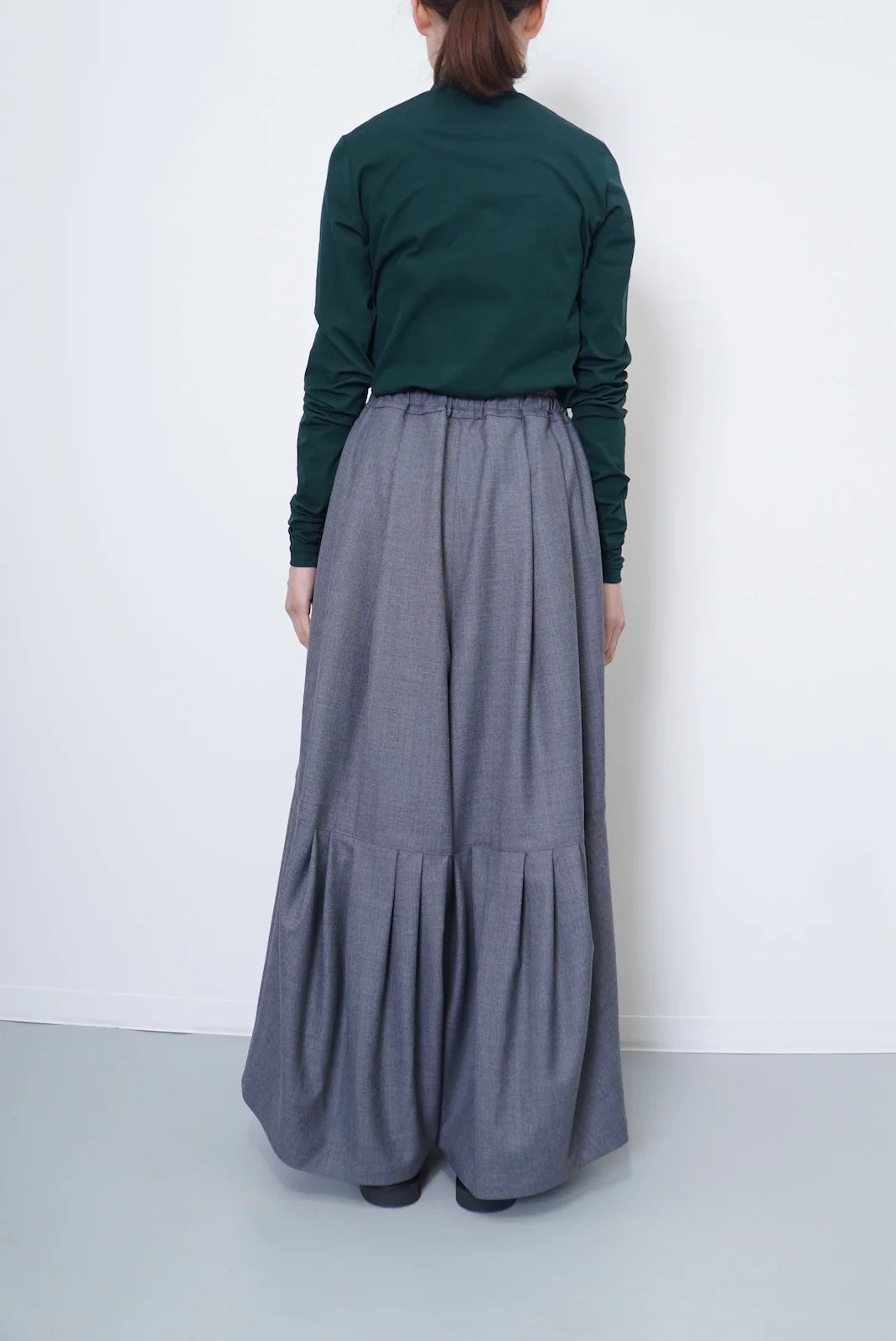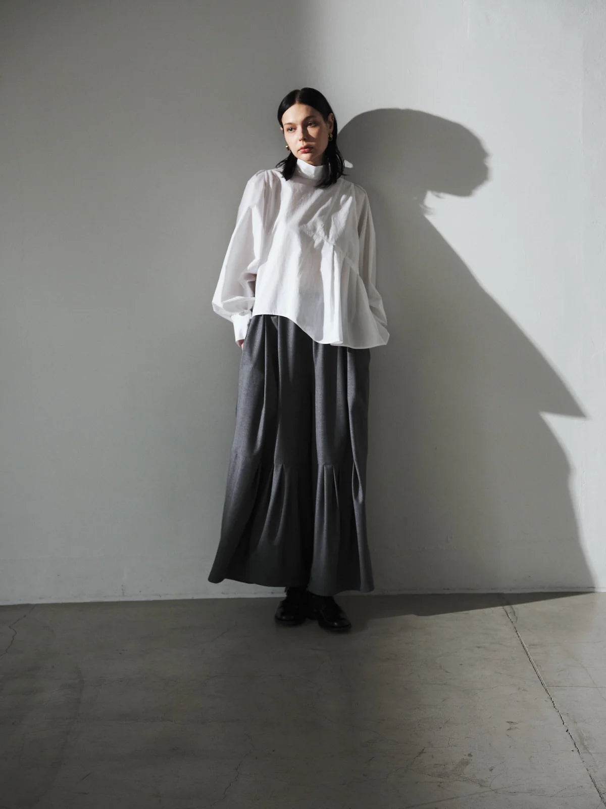 The dress pants skirt features tucks at the seams that add volume and a generous use of fabric, creating a unique silhouette. It also features side pockets for functionality, and the elastic waistband and adjustable drawcord ensure a comfortable fit.