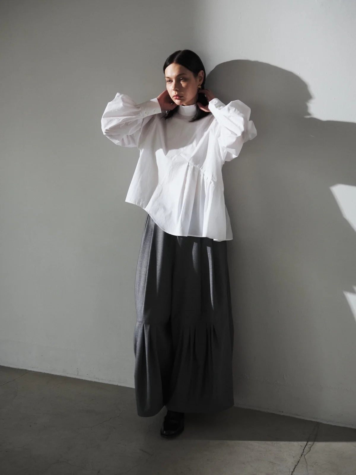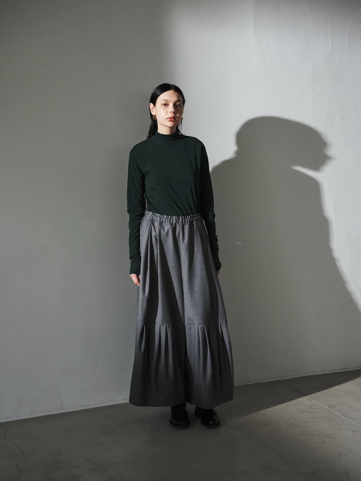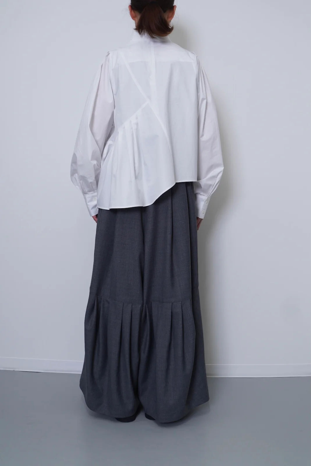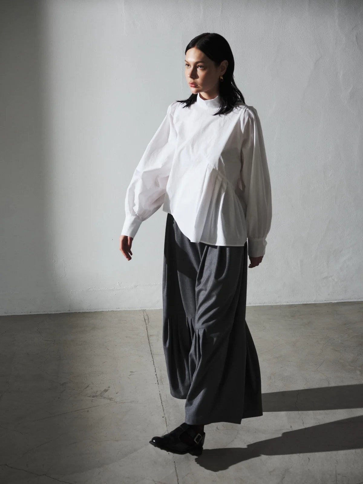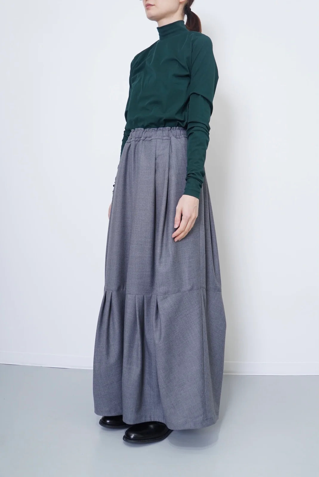 The dress pants skirt features tucks at the seams that add volume and a generous use of fabric, creating a unique silhouette. It also features side pockets for functionality, and the elastic waistband and adjustable drawcord ensure a comfortable fit.