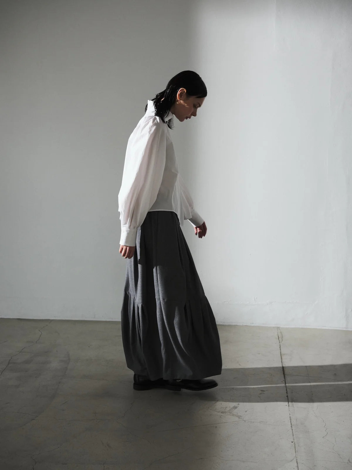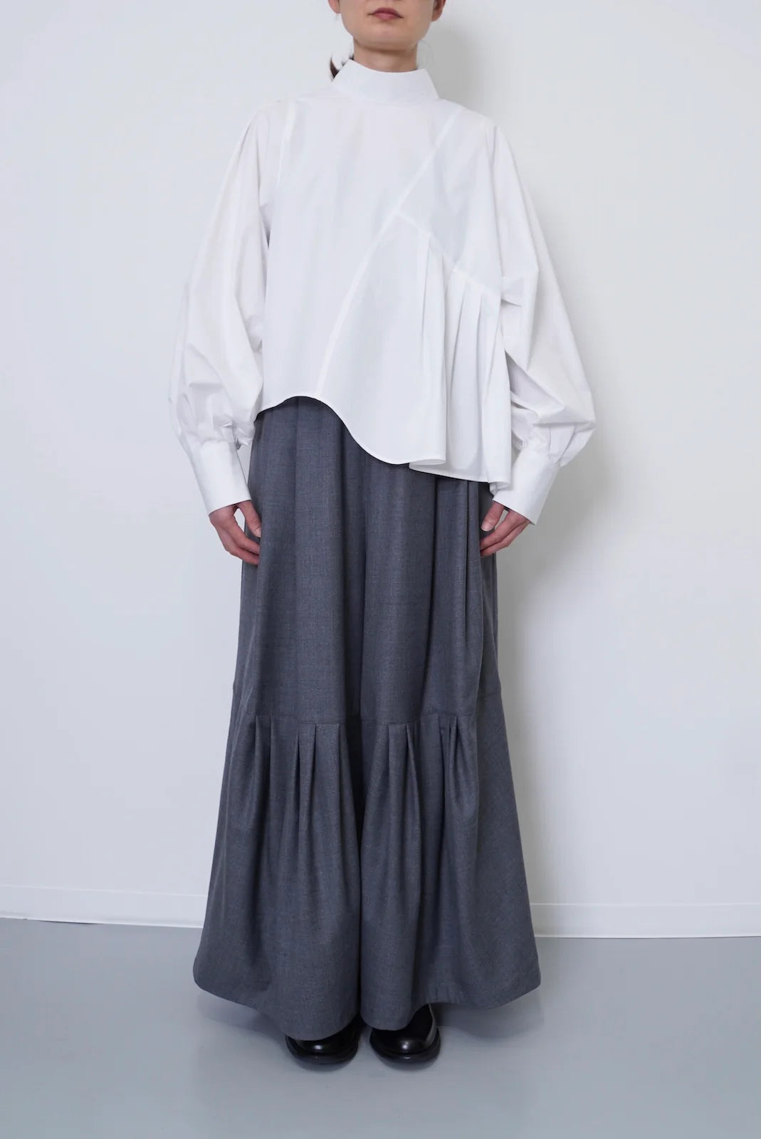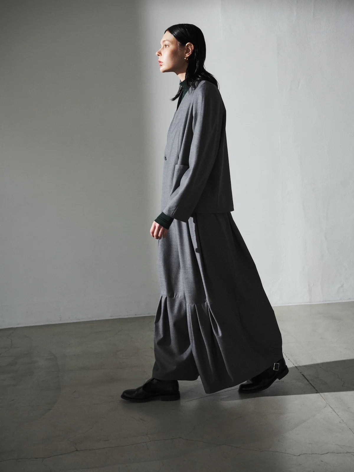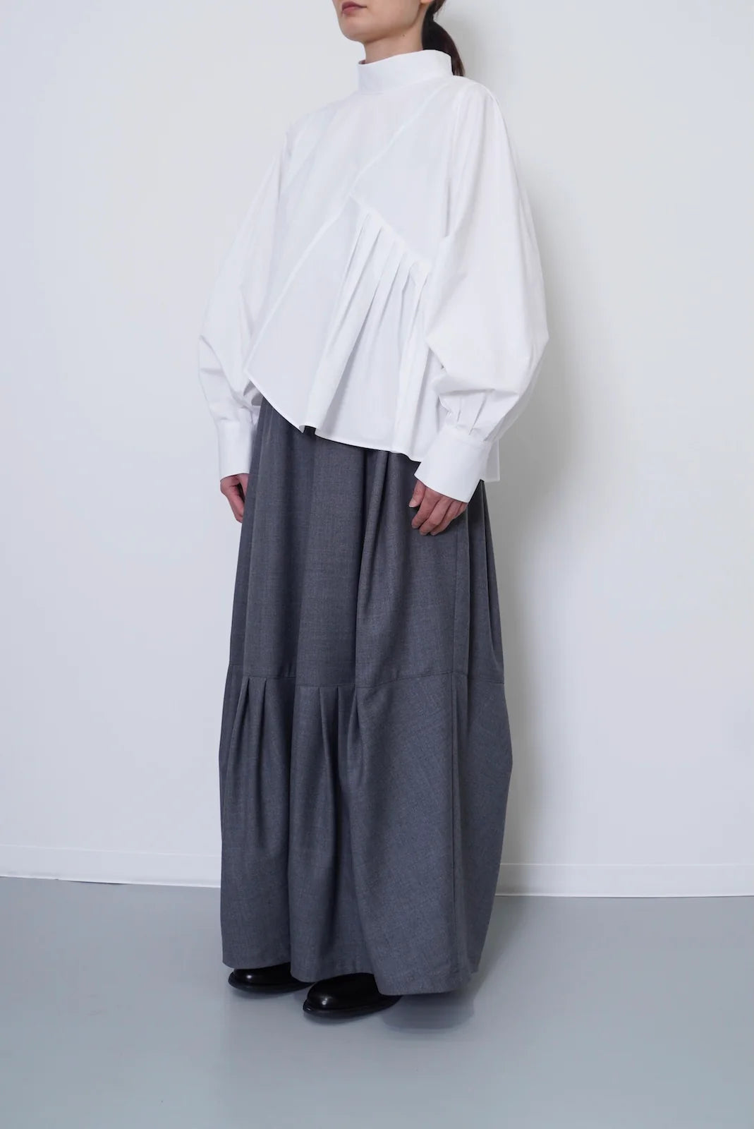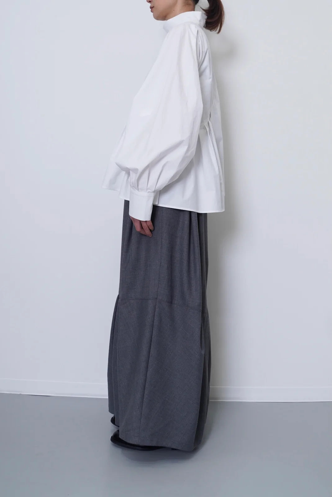 The dress pants skirt features tucks at the seams that add volume and a generous use of fabric, creating a unique silhouette. It also features side pockets for functionality, and the elastic waistband and adjustable drawcord ensure a comfortable fit.