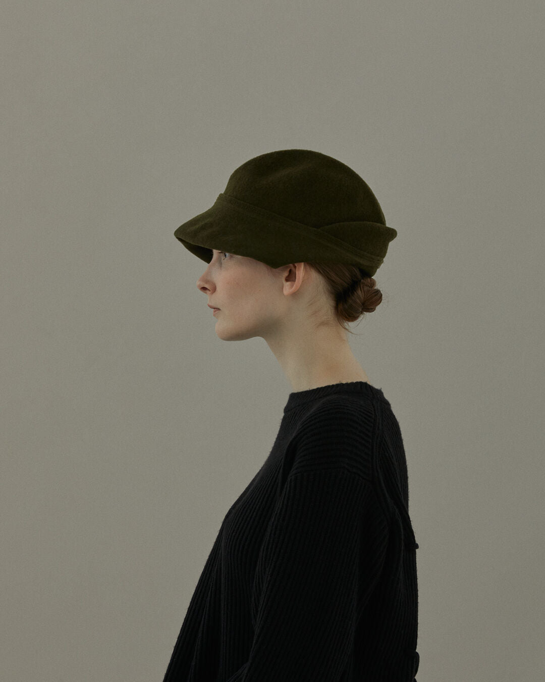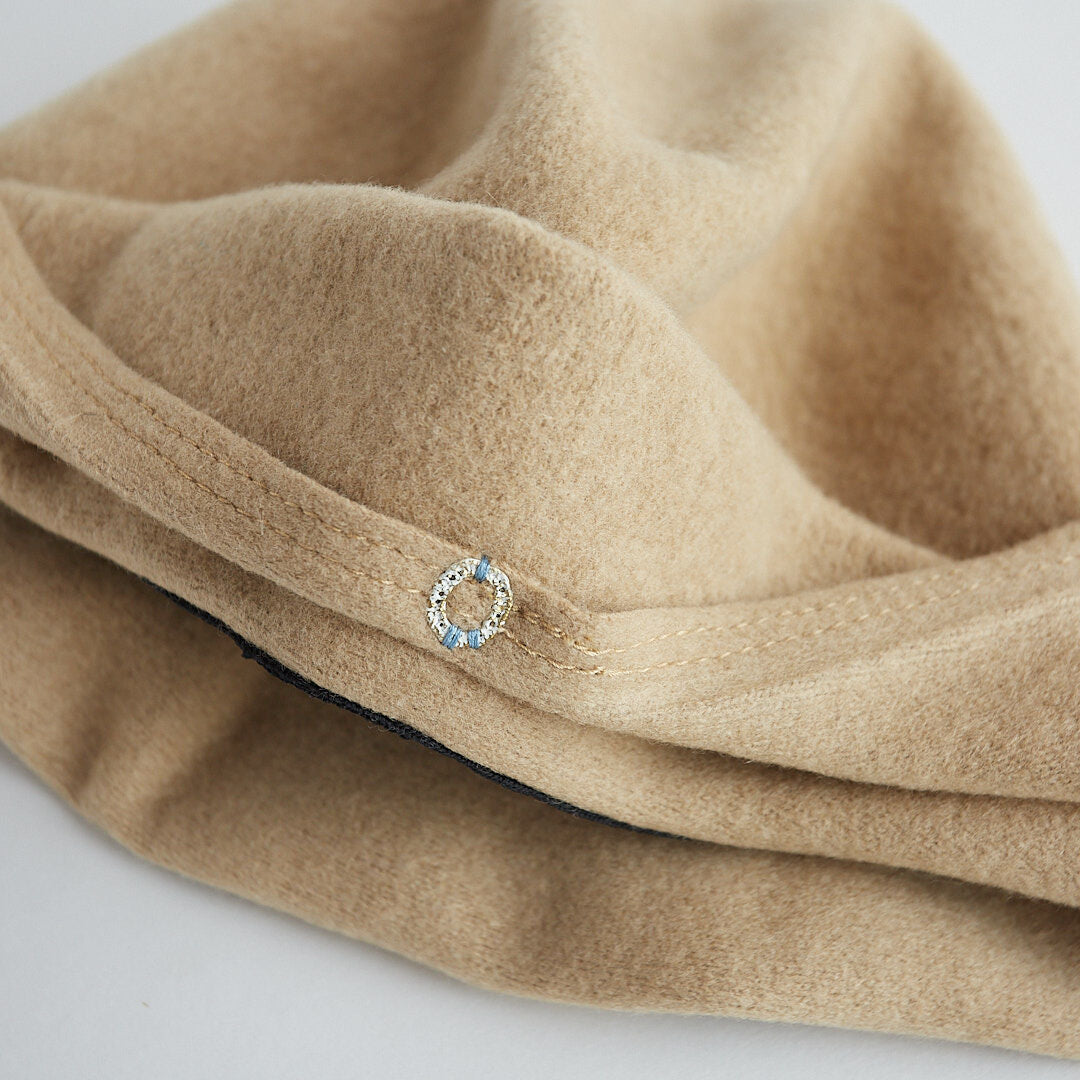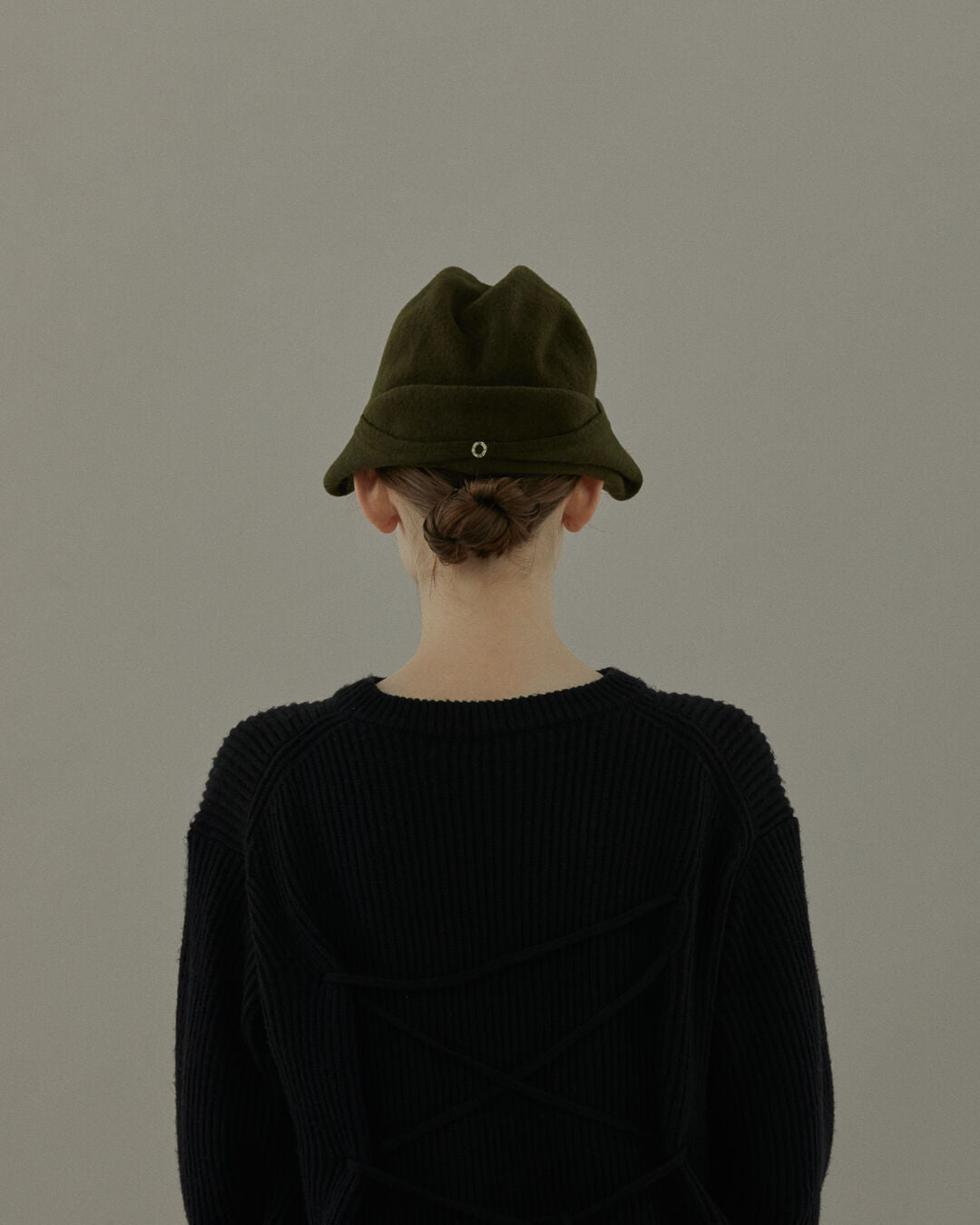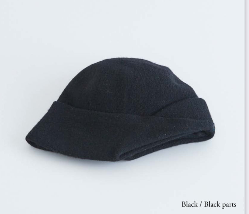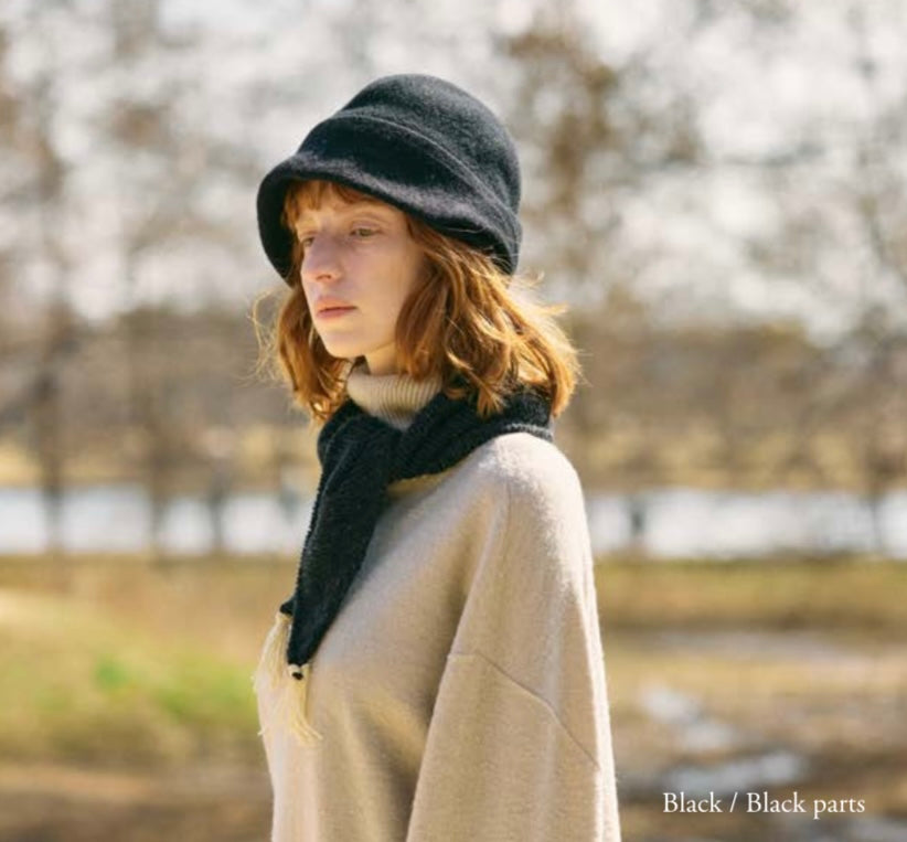 Being one of chisaki’s staple pieces, Tieka is a very popular hat. In this season, we have upgraded it by making it slimmer, so as to be easier to shape and to leave a neat impression. By folding and using the brim differently, this hat shows numerous possibilities in its appearance with no effort at all. You can also vary which part of the hat you wear in front, to go best with your look. With its soft, bouncy nature, the cashmere mixed material is easy to maneuver into shape and sits with it nicely. A neat, beautiful appearance is created from the tonal stitching of the main colour on the brim. *Size adjustable with the inner tape. *The charm is made by the metal artist, Seiko Obara.